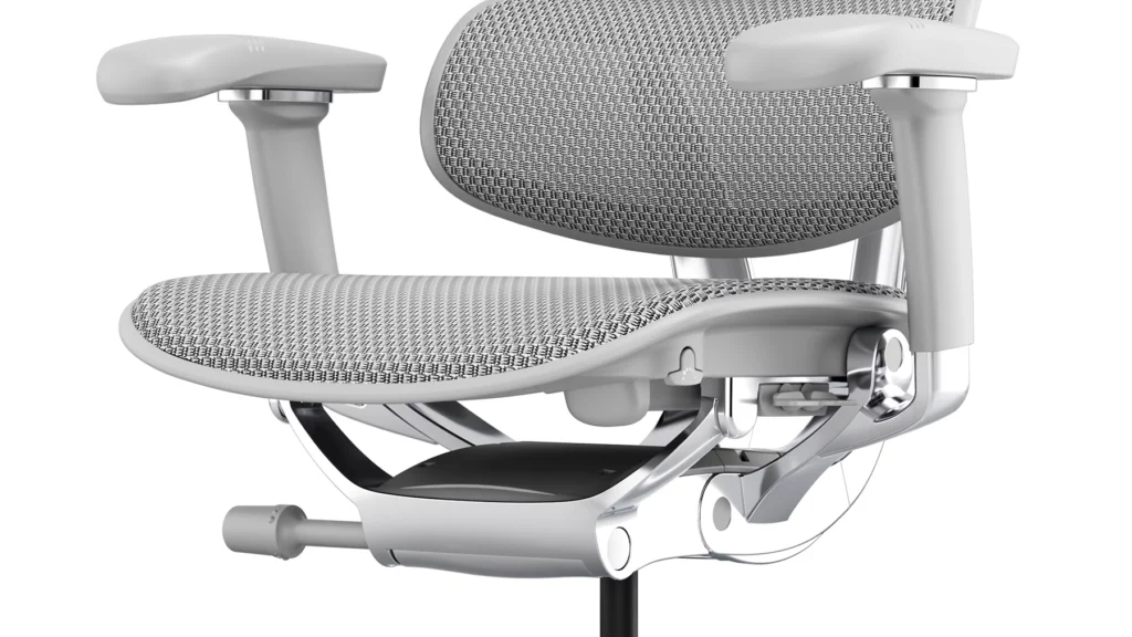 • Grey office chair Ergohuman 2 Elite mark II Platinum with grey frame, grey mesh and leg rest front viewGrey office chair Ergohuman 2 Elite mark II Platinum with grey frame, grey mesh and leg rest front with leg rest extended
